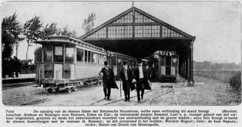 Na enkele mislukte pogingen om een tramlijn door de Over-Betuwe op te zetten, volgde er in 1903 een nieuw initiatief waarbij de Bemmelnaren P. van Bunge, W. Breunissen, H. Langemeijer, C. Rijssenbeek en J. Stolk betrokken waren. Nadat zij de burgemeester van Elst, Baron Van der Feltz, warm hadden gemaakt voor hun plannen, werd een comité gevormd waar ook G. Erdkamp uit Elst, A. Knipping uit Lent en J. Pruijn uit Elden toetraden.